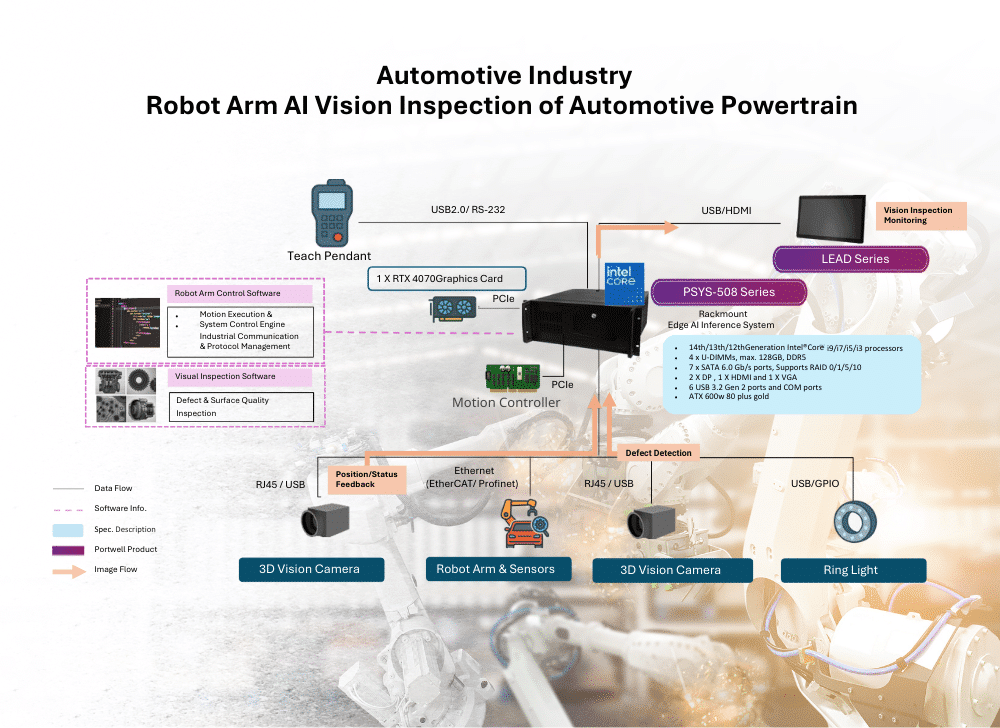 Traditional manual inspection of powertrain parts is inefficient and error-prone due to human factors and limited coverage of complex structures. Delayed defect detection from lacking real-time feedback increases rework costs and brand risk. Consequently, robotic arm and machine vision Edge AI automated inspection systems are trending. These systems flexibly cover inspection points, enabling flaw detection, precision comparison, position verification, and sub-component completeness. Real-time inference and data feedback allow manufacturers to proactively control process quality, improving yield, enhancing production quality, and bolstering customer trust.