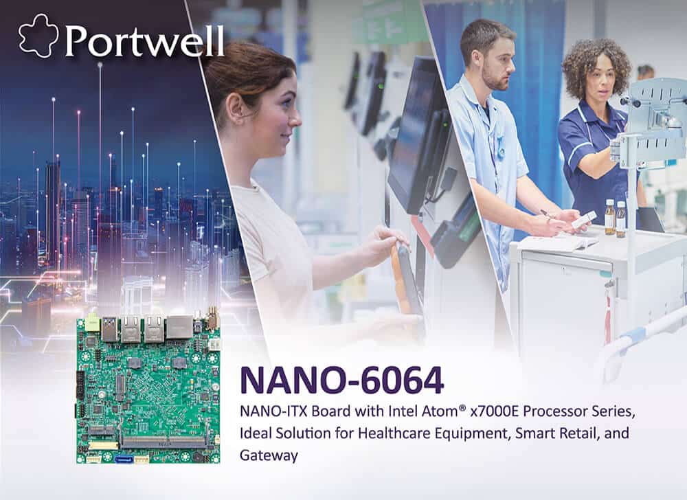 The Portwell NANO-6064 Nano-ITX embedded system board is built with the Intel Atom x7000E series processors, Intel Processor N series and Intel Core i3 N-series processors, with selected SKUs supporting fan-less design, while also for the first time, users can scale up to Intel Core i3 computing within an N-series platform for up to 3.8GHz maximum turbo frequency. NANO-6064’s flat/low-profile design allows space-saving system configuration in digital display and compact workstations, such as digital signage and control solutions for use cases in industrial automation and healthcare. Blended in with these Intel processors’ enhanced power efficiency, computing performance, deep-learning inference accelerators, and integrated Intel UHD graphics, Portwell’s NANO-6064 is suitable for an extensive array of applications, including but not limited to, AI-assisted healthcare/medical imaging devices, retail POS systems, digital signage, IoT edge gateway, and office and industrial automation.